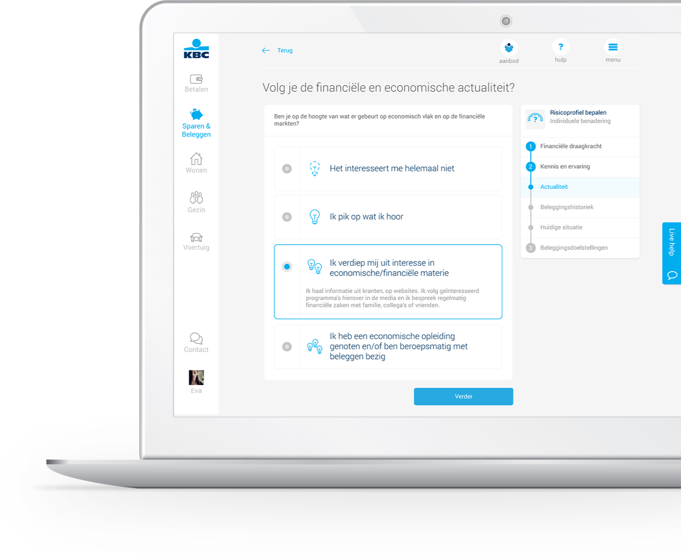 As a User Experience designer at KBC and Colruyt and as a service designer at Knight Moves I worked on products such as KBC Touch, KBC Invest, the new colruyt.be website, a Colruyt Group digital styleguide for internal applications, the project “woningpas” for the flemisch government and much more.Within my job I apply a design thinking methodology (empathize – define – ideate – prototype – test). I start by gathering both business and user requirements to create my first wireframes (low fidelity). After a couple of iterations the prototype becomes more detailed. When the prototype gets more elaborated, I mostly work in scrum with a development team to technically validate and finalise the result.